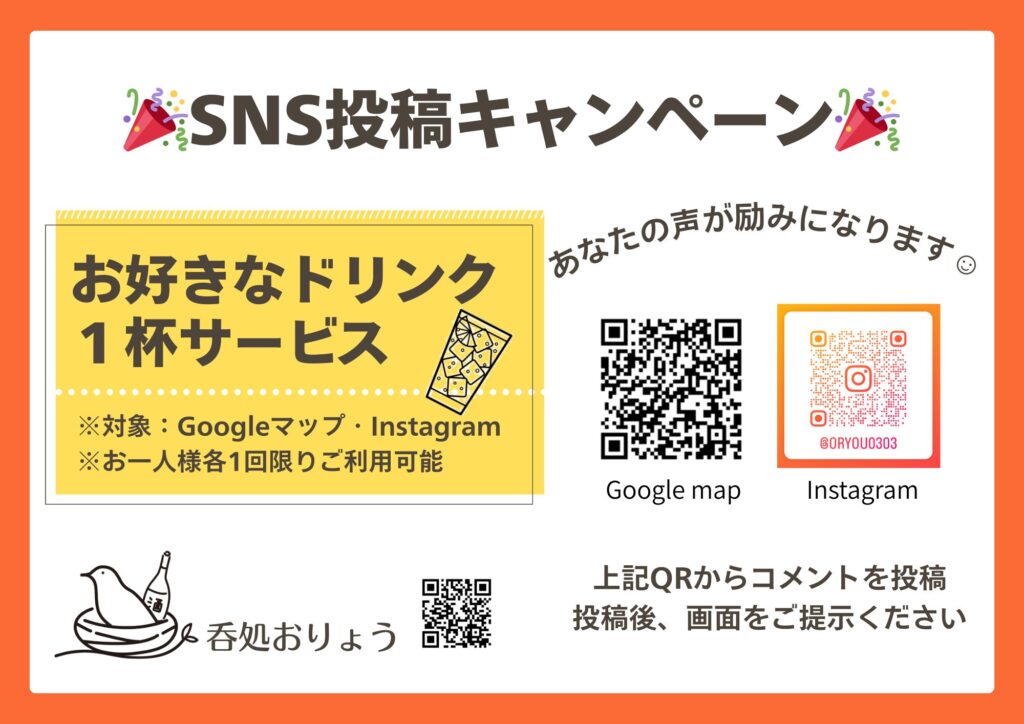 2026年2月27日 / 最終更新日時 : 2026年2月27日 oryou 新着 SNS投稿でドリンク1杯サービスします☺ InstagramまたはGoogleマップにひと言コメントをいただけたら🍺ドリンク1杯サービスします 🍷皆さまの応援が本当に力になります。